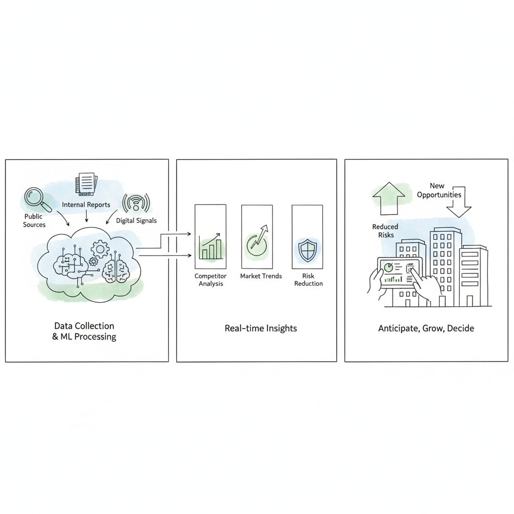 Attraverso algoritmi proprietari di machine learning, raccoglie e processa dati eterogenei – da fonti pubbliche, report interni e segnali digitali – trasformandoli in insight chiari, contestualizzati e immediatamente azionabili.
